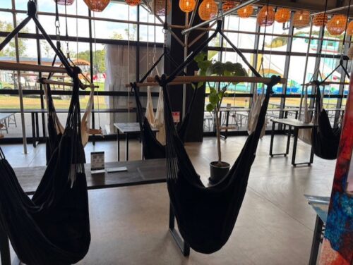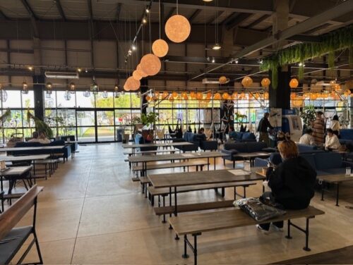 1500人規模のホールがあり、博多風の飲食エリア、DJやライブイベントが楽しめます。フードコートにはQRオーダー&キャッシュレス決済のみ、ブランコやハンモック席、キッズスペースを完備。 -